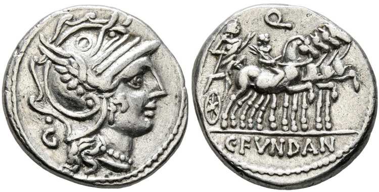 Caius Fundanius Denarius. ca 110 BC. Helmeted head of Roma right, control letter behind head / triumphor (Q Marius?) driving quadriga right, his son riding one of the horses & holding laurel branch, Q above, C.FVNDAN in ex. Syd 583, Cr 326/1.