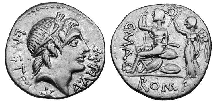C. Publicius Mall., A. Postumius Albinus & L. Metellus, AR denarius, 96 BC. 3.90 g. L METEL A ALB S F, Laureate head of Apollo right, star beneath chin / C MALL, Roma seated left on pile of shields, holding sceptre, being crowned by Victory standing left behind her. ROMA below. Caecilia 46; Postumia 3; Syd. 611a; C 335/1b; Sear 220.
