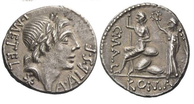 L Caecilius Metellus. 96 BC. AR Denarius. L•METEL A•ALB•S•F, laureate head of Apollo right; star below / C•MALL, ROMA in exergue, Roma seated left on pile of arms, being crowned by Victory. Cr335/1b; Syd 611a.