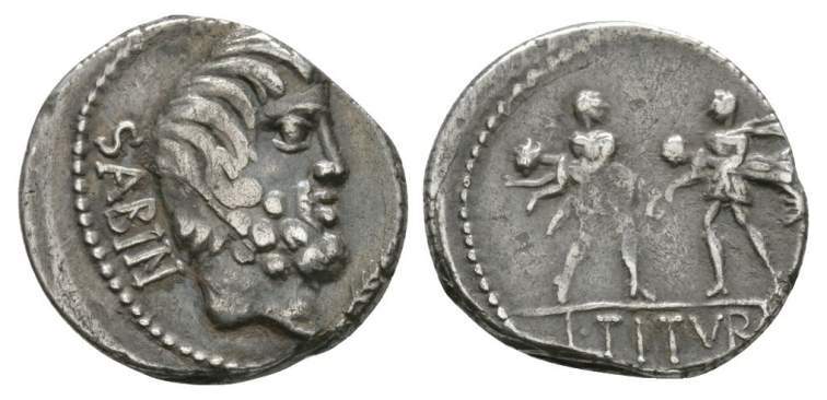 L. Titurius L.f. Sabinus. 89 BC. AR Denarius. Head of Tatius right; SABIN behind, TA before / Two Roman soldiers, each carrying a woman; L. TITVRI in exergue. Cr344/1a; Syd 698.