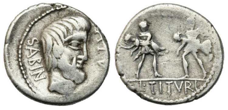 L Titurius L.f. Sabinus Denarius. 89 BC. Head of Taitus facing right, SABIN behind, A PV before / two Roman soldiers, each holding a woman in his arms, L.TITVRI in ex. Cr344/1c, Syd 698b.