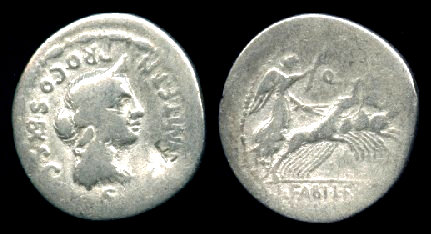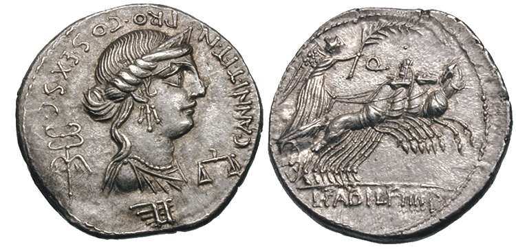 C Annius Tf Tn Luscus & L Fabius Lf Hispaniensis AR Denarius. ca 82-81 BC. Northern Italian or Spanish military mint. Diademed & draped bust of Anna Perenna right, winged caduceus behind, scales under chin, control letter below neck, C ANNI T F T N PRO COS EX S C arching above / Victory in quadriga right, Q above, L FABI L F HISP in ex. Cr366/1c, Syd 748b.