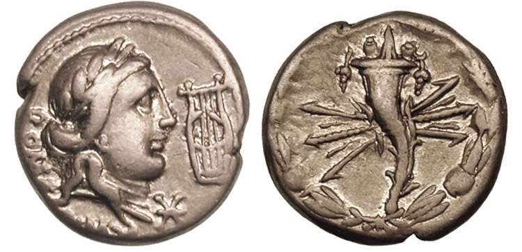 Q. Fabius Maximus. 82-80 B.C. AR Denarius. Laureate head of Apollo r.; behind, ROMA; below, Q. MAX; before, lyre and star / Cornucopiae superimposed on thunderbolt; around, wreath composed of ear of barley, ear of wheat and assorted fruits. Syd 718, Cr371/1.