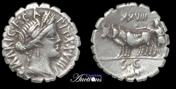 C. Marius C.f.Capito, 81 BC. AR Serrate Denarius. C MARI C F CAPIT, draped bust of Ceres right / farmer ploughing with yoke of oxen, SC in ex. Cr378/1b, Syd 744a.