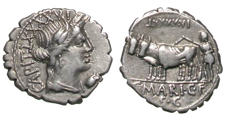 C Marius C f Capito Denarius. 81 BC. CAPIT and numeral, bust of Ceres right, wreathed with corn, symbol below chin / plowman with yoke of oxen plowing left, same numeral above, C MARI C Fi below, SC in ex. Syd 744b, Cr378/1c.
