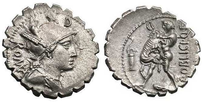 C Poblicius Qf Denarius Serratus. 80 BC. ROMA, draped bust of Roma right, helmeted & decorated with corn ears, control mark letter above / C•POBLICI•Q•F, Hercules strangling the Nemean lion, club at his feet, bow and arrow in quiver on left, control mark letter, often retrograde, in upper left field. Cr380/1, Syd 768.