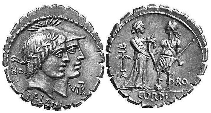 Q. Fufius Calenus & Mucius Cordus. 68 BC. AR Serrate Denarius. HO left, VIRT right, KALENI below, jugate heads of Honos & Virtus right / ITAL left, RO right, CORDI in exergue, Italia & Roma standing hand in hand.