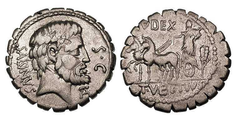 T. Vettius Sabinus. 66 BC. Denarius. Bare head of Tatius right; SABINI behind, S.C before, TA in monogram under chin / Togate figure in walking biga left, IVDEX above, corn-ear to right, T.VETTIVS in exergue. Crawford 404/1; Syd 905.