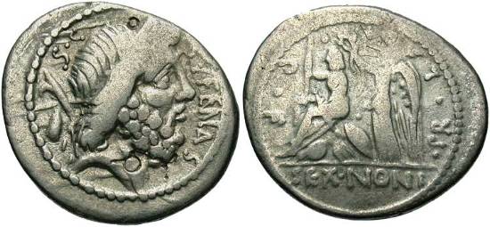 M. Nonius Sufenas. 57 BC. Denarius. SVFENAS right, S.C left, head of Saturn right; harpa and conical stone behind / PR. L. V. P. F. around, SEX. NONI in ex, Roma seated left being crowned by Victory. Crawford 421/1; Syd 885.