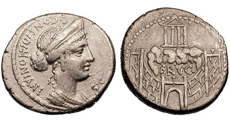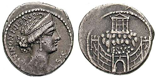 C Considius Nonianus Denarius. C CONSIDI NONIANI, laureate & diademed bust of Venus Erycina right / Temple on summit of mountain, surrounded with rampart, ERVC above gateway in center. Cr424/1.