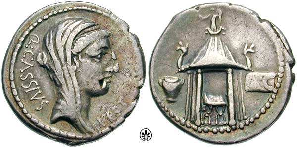 Q. Cassius Longinus, AR denarius, (3.54g) c. 55 BC, Q CASSIVS VEST Veiled head of Vesta right. / Curile chair within circular temple of Vesta between urn and vota tablet inscribed AC. Syd. 917; C428/1.