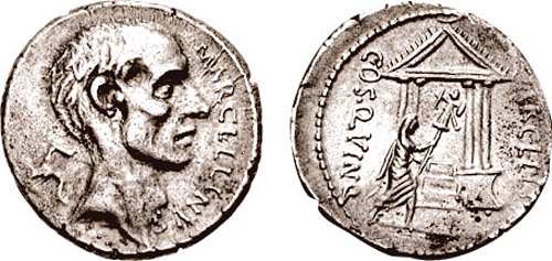 P Cornelius Lentulus Marcellinus AR Denarius. 50 BC. Bare head of the consul M Claudius Marcellus right; triskeles behind / M. Claudius Marcellus carrying trophy within tetrastyle temple. Cr439/1.