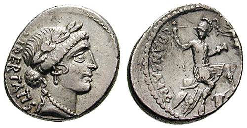 C Vibius C f C Pansa Caetronianus Denarius. 48 BC. LIBERTATIS, laureate head of Libertas right / C PANSA C F C N, Roma seated right on pile of Gaulish sheilds, being crowned by Victory flying to left. Syd 949, Cr449/4.