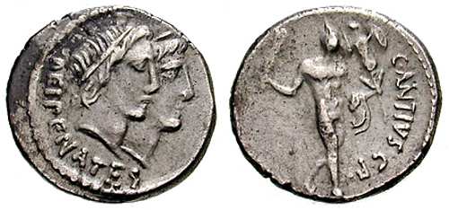 C Antius Cf Restio AR Denarius. Circa 47 BC. Jugate heads of the Dei Penates right / Hercules walking right, cloak over arm. Cr455/2a.