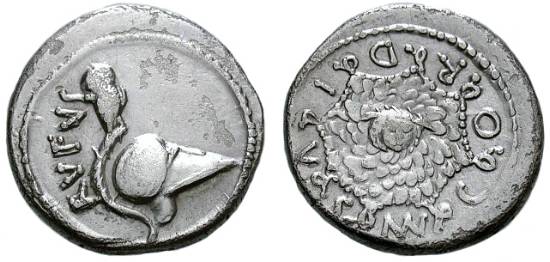 Mn Cordius Rufus Denarius. 46 BC. Corinthian helmet with crest on which an owl stands / Aegis of Minerva with head of Medusa in the center. Cr463/2, Syd 978.