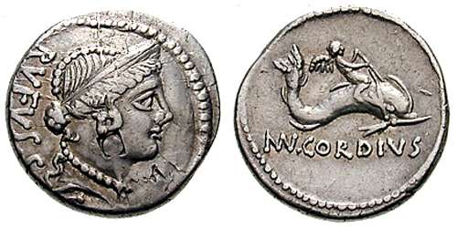 Cordius Rufus Denarius. 46 BC. RVFVS S C, diademed head of Venus right / M N CORDIVS, Cupid riding on dolphin right. Syd 977, Cr463/3.