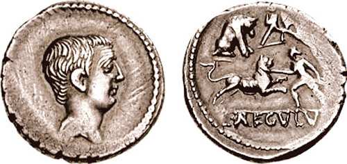 L Livineius Regulus Denarius. 42 BC. Small bare head of the praetor L Livineius Regulus right / L REGVLVS in exergue, combatants with wild animals: one combatant attacks a lion with a spear; another, with shield and sword, defends himself against a tiger; a wounded boar sits on the left, facing right. Cr494/30, Syd 1112.