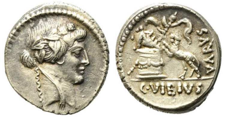 C. Vibius Varus. Circa 42 BC. AR Denarius 18mm, 4.16 g. Head of Bacchus right, wearing wreath of ivy and grapes. / VARVS upwards to right, C VIBIVS below, Panther springing left towards altar; mask right on altar and filleted thyrsus behind. Crawford 494/36; CRI 192; Sydenham 1138; Vibia 24.