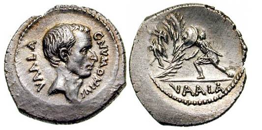C Numonius Vaala AR Denarius. 41 BC. Bare head of Numonius Vaala right / Warrior attacking camp with two defenders. Cr514/2.