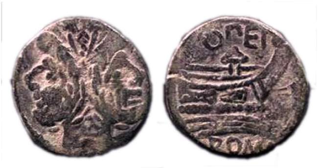 OPEI, AE as, (22.49g) c. 169-158 BC, Laureate head of Janus right, I above. / Prow right, OPEI above, I before, ROMA below. C190/1, Syd.363.