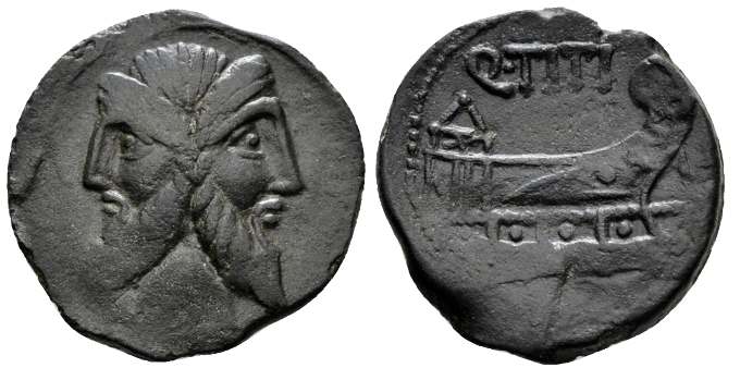 Q Titius AE As. 90 BC. Laureate head of Janus with long pointed beard / prow right, Q TITI above. Syd 694, Cr341/4a.