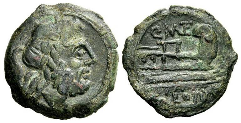 Q. Caecilius Metellus, AE Semis, Rome, 130 BC, 6.15 g. Head of Saturn right, S behind head / Q MET ligate above prow right, S in right field, ROMA below. Cr-256/2a note; Caecilia 22; Syd. 510; BMCRR Rome 1059; Sear 877.