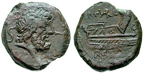 M Vargunteius AE Semis. 130 BC. Laureate head of Saturn right / Prow right; M•VARG above. Cr257/2.