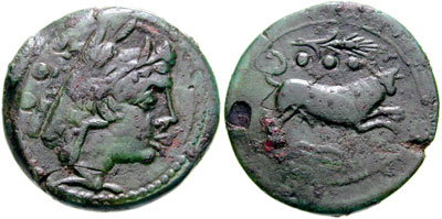 Anonymous. 211-210 BC. Æ Quadrans. Sicilian mint. Head of Hercules right, in boar’s skin; three pellets behind / Bull charging right; grain ear & three pellets above, snake below, ROMA in ex. BMCRR 140.