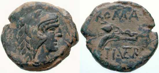 Ti. Veturius. 137 BC. Æ Quadrans. Head of Hercules right, in lion’s skin; three pellets behind / Oil-jar on thong & strigil; ROMA above, TI. VETVR below. Syd 028, Cr234/2b.