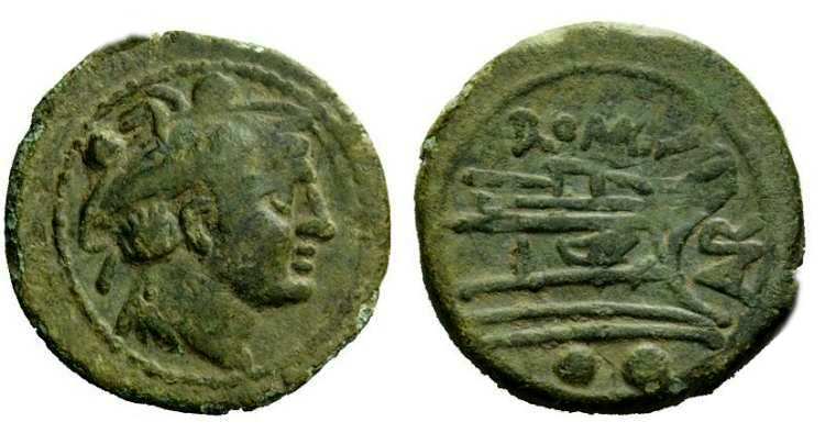 AVR, AE sextans, 209 BC. Draped bust of Mercury right, wearing square cap, two dots above. / Prow right, ROMA above, AVR before, two dots below. C65/6.