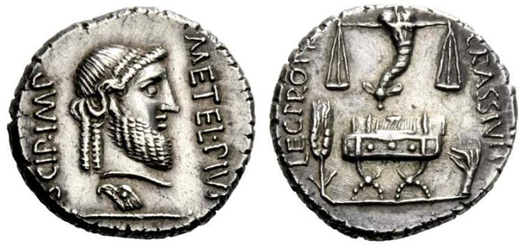 Q Metellius Pius Scipio Denarius. 46 BC. METEL PIVS SCIP IMP, head of Jupiter right, eagle's head and sceptre below / CRASS IVN LEG PRO P R, curile chair between corn ear a& carnyx, cornucopiae supporting scales. Cr460/2, Syd 1048.