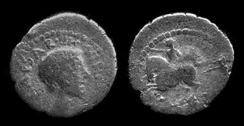 Octavian Denarius. 41 BC. C CAESAR III VIR R P C. bare head of Octavian right / POPVL IVSSV, equestrian statue of Octavian left. Syd 1317, Cr518/2.