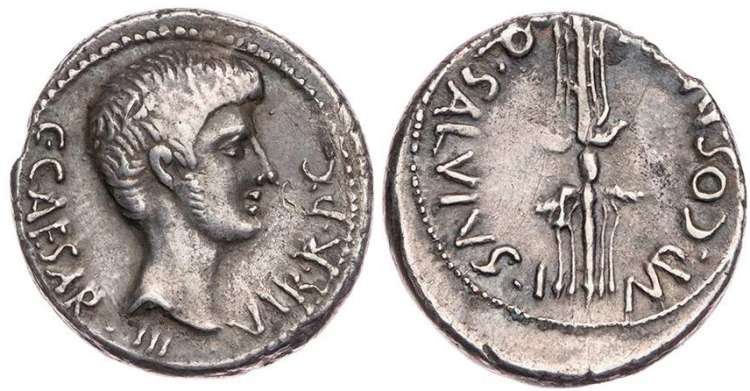 Octavian F Salvienus Imperator, AR denarius, 3.63 g, struck 40 BC, mobile mint in Italy. C CAESAR III VIR R P C, Bare head of Octavian right, lightly bearded. / Q SALVIVS IMP COS DESIG, winged thunderbolt. RSC 514; Crawford 523/1; Syd. 1326b.