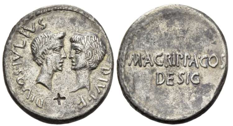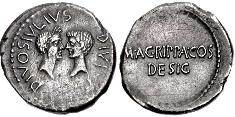 Octavianus and M. Vipsanius Agrippa. AR Denarius, mint moving with Octavian, 38 BC, 19mm, 3.63 g. DIVOS IVLIVS DIVI F, wreathed head of Julius Caesar right facing bare head of Octavian left. / M AGRIPPA COS DESIG in two lines. RSC 5; Crawford 534/2; Babelon Julia 129 and Vipsania 2; Sear Imp. 306.