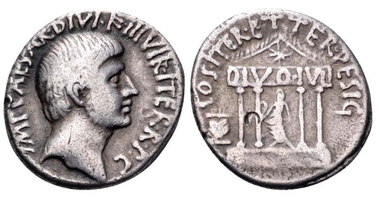 Octavian AR Denarius. 36 BC. Mint moving with Octavian. IMP CAESAR DIVI F III VIR ITER RPC, bare head right / COS ITER ET TER DESIG, tetrastyle temple with Julius Caesar standing within, DIVO IVL on the architrave, star in pediment, lit altar to left. Crawford 540/2; Syd 1338; Babelon 139; RSC 90; Sear Imp. 315; Sear 1545.