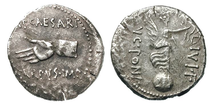 Octavian Denarius. Cyrenaica, provincial governor L Pinarius Scarpus, ca 31–29 BC. IMP. CAESARI above, SCARPVS. IMP below, open right hand reaching left / DIVI. F on right, AVG. PONT on left, Victory standing right on globe, holding wreath. Cr546/6, Syd 1282, RSC 500.