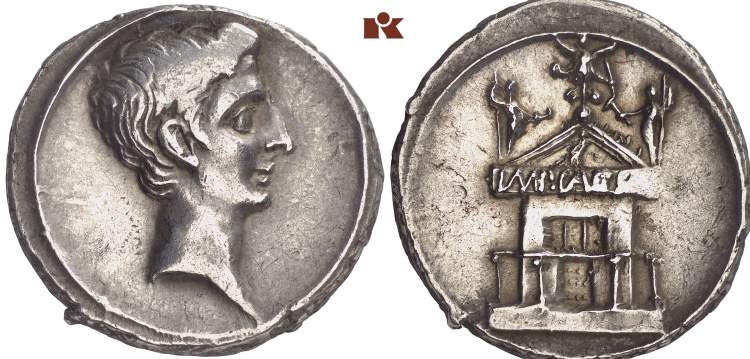 Octavian Denarius. Uncertain Italian mint, 29-27 BC. Bare head right / IMP CAESAR on architrave of temple with colonnaded base; Victory on globe at apex of pediment, and warriors at the angles. RSC 122.