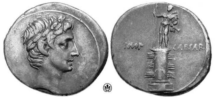 Octavian Denarius. 29-27 BC. Laureate bust right / IMP - CAESAR, statue of Octavian on rostral column. RSC 124.