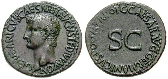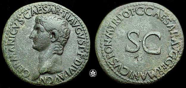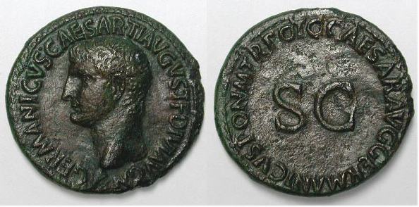 Germanicus Æ As. Struck under Caligula, 37-38 AD. GERMANICVS CAESAR TI AVGVST F DIVI AVG N, bare head left / C CAESAR AVG GERMANICVS PON M TR POT around large SC. Cohen 1.