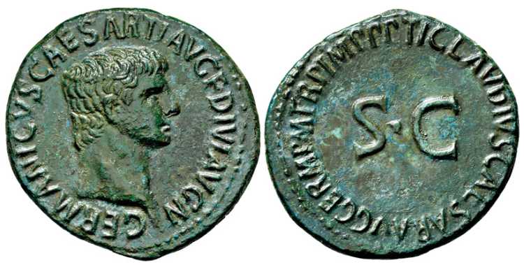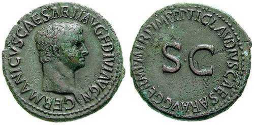 Germanicus Æ As struck under Claudius. GERMANICVS CAESAR TI AVG F DIVI AVG N, bare head right / TI CLAVDIVS CAESAR AVG GERM P M TR P IMP P P around large SC. Cohen 9.