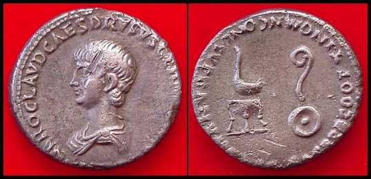 Nero, as Caesar, AR Denarius. 51-54 AD. NERO CLAVD CAES DRVSVS GERM PRINC IIVENT, young draped bust left / SACERD COOPT IN OMN CONL SVPRA NVM EX SC, simpulum on tripod and lituus on patera. RSC 312.