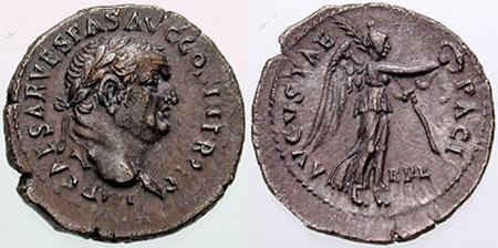 Vespasian Denarius. Ephesus mint, 71 AD. IMP CAESAR VESPAS AVG COS III TR P P P, laureate head right / PACI AVGVSTAE, Victory walking right, holding wreath in right hand, palm over left shoulder, EPHE monogram at foot right. RSC 276, RPC 833.
