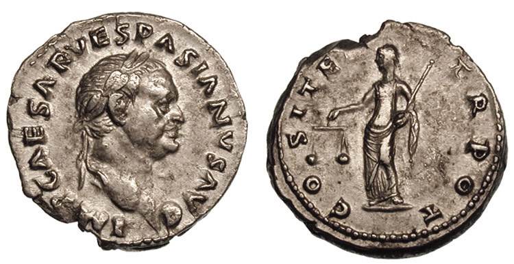 Vespasian AR Denarius. 70 AD. IMP CAESAR VESPASIANVS AVG, laureate head right / COS ITER TR POT, Aequitas standing left, holding scales & sceptre. RSC 94a.