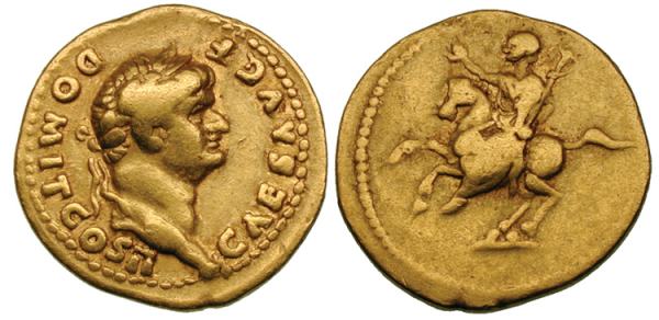 Domitian, as Caesar, AV Aureus. Rome, 73 AD. CAES AVG F DOMIT COS II, laureate head right / Domitian on horse leaping left, raising right hand & holding sceptre surmounted by human head. Cohen 663.
