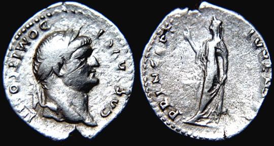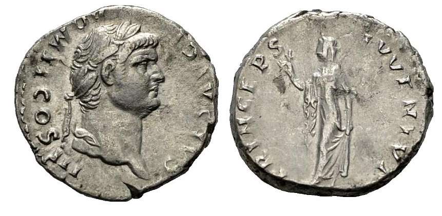 Domitian as Caesar denarius. CAES AVG F DOMIT COS III, laureate head right / PRINCEPS IVVENTVT, Spes standing left with flower & raising skirt. RSC 375.