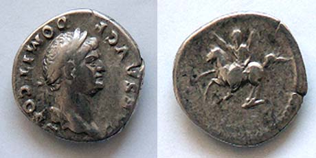 Domitian Denarius. CAES AVG F DOMIT COS II, laureate head right / Domitian riding horse left, raising hand & holding sceptre surmounted by a human head. RSC 664.