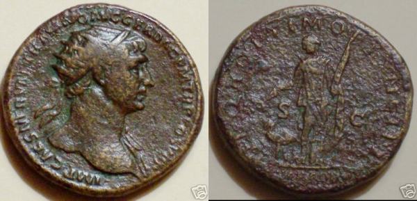 Trajan AE Dupondius. IMP CAES NERVAE TRAIANO AVG GER DAC P M TR P COS V P P, radiate bust right, slight drapery on far shoulder / S P Q R OPTIMO PRINCIPI S-C, ARAB ADQVIS in ex, Arabia standing left holding bundle of (cinnamon?) sticks, camel at foot left. BMC 919.