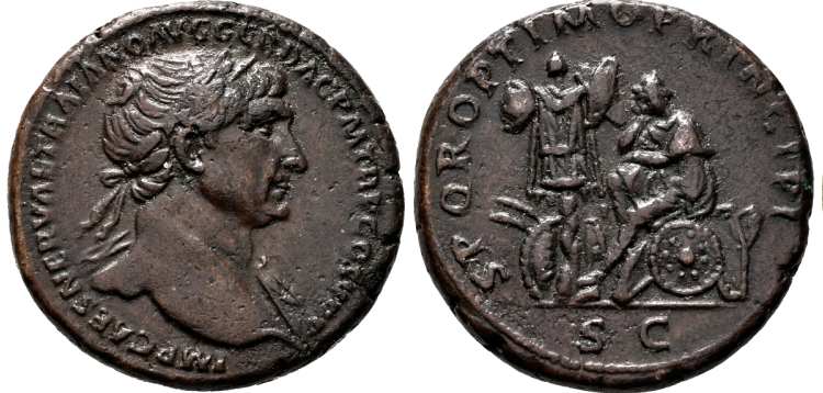 Trajan AE As. 103-111 AD. IMP CAES NERVA TRAIANO AVG GER DAC PM TR P COS V P P, laureate, draped bust right / SPQR OPTIMO PRINCIPI, Dacia seated left on shield, trophy before, SC in ex. Cohen 532.