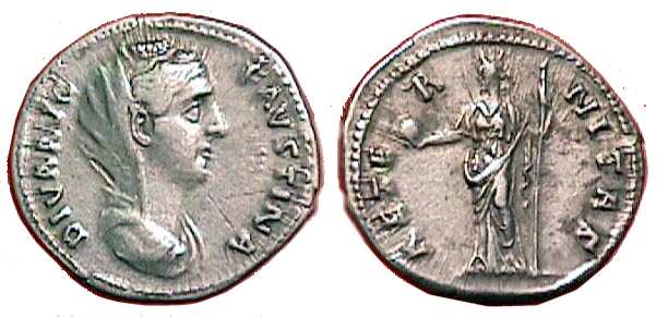 Diva Faustina Sr Denarius. DIVA AVG FAVSTINA, draped bust right / AETERNITAS, Aeternitas standing left, holding globe and sceptre. RSC 34.
