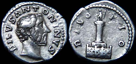 Antoninus Pius Denarius. DIVVS ANTONINVS, bare head right / DIVO PIO, Statue on column with fence surrounding base of column.
